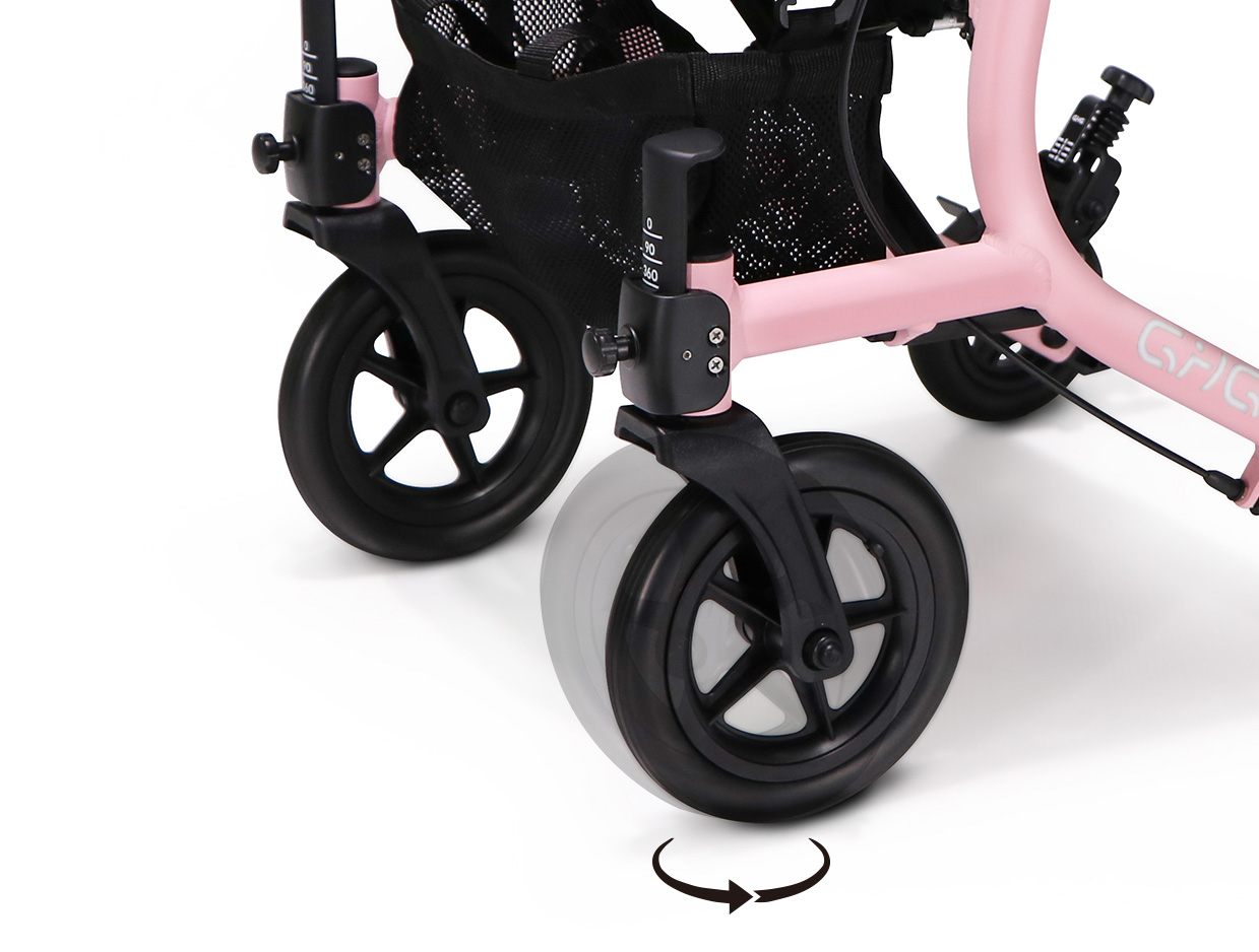 廣翰助行器 R2安行系列前輪特設轉向定位功能,可在360°自由方向、90°有限範圍與0°固定直線間切換。適應不同場景,無論是室內、斜坡或碎石路,皆能穩定行走,靈活應對每一步