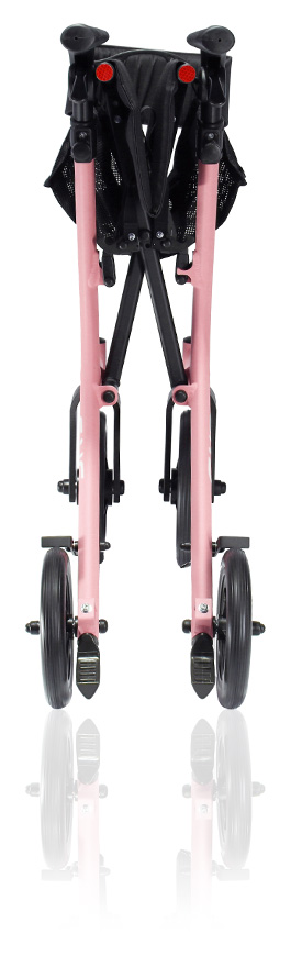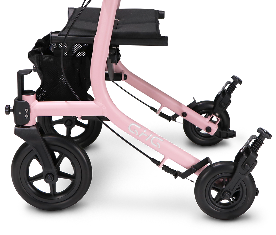 GHG 廣翰助行器前大後小輪徑巧妙搭配,提供卓越穩定性,防止傾斜風險。後輪具備減速調節功能,完美契合長者行走速度